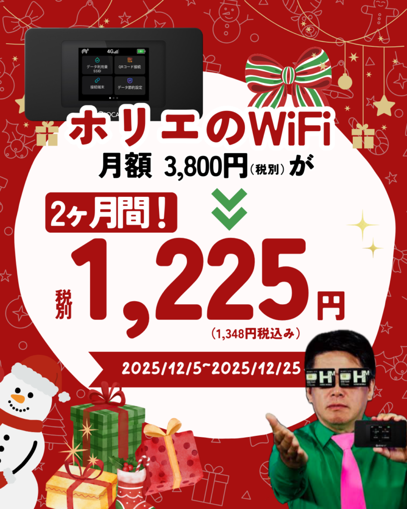 ホリエWiFiが今お得です!!!! 2025年12月19日 最終更新日時 : 2025年12月19日 xmobile-fukuchiyama クリスマスまでの限定キャンペーン!! 月額¥3800(税抜) → ¥1225(税抜) クリスマス価格になります!!! 問合せのみのご来店ももちろん歓迎です!!!