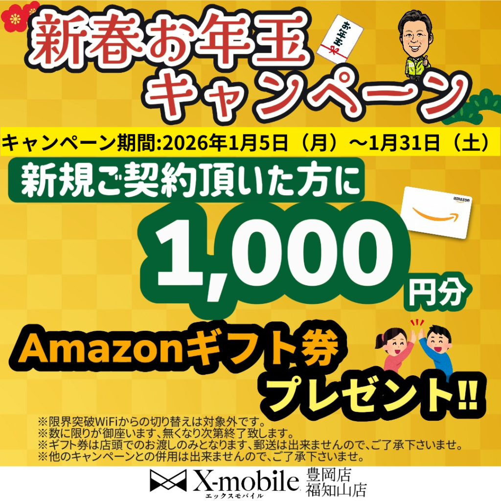 ただいまエックスモバイル福知山店では年明けキャンペーンで新規契約者様にAmazonギフト券をプレゼントしております!